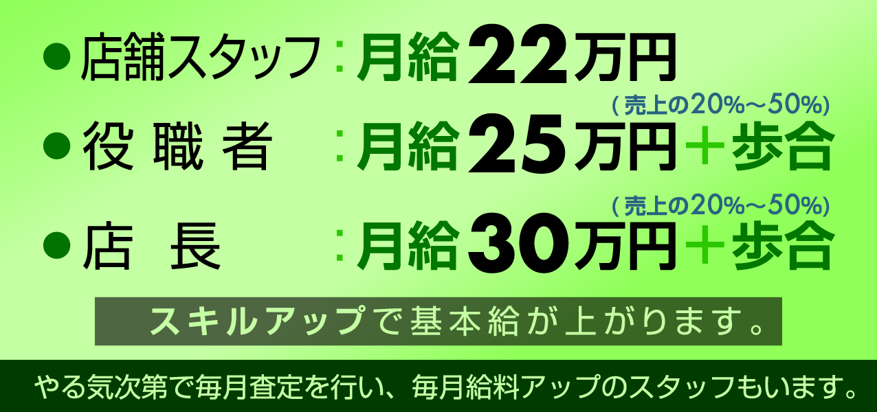 ☆昇給・昇格随時☆入社1年で幹部クラス可能!やる気があれば半年足らずで即店長クラスも夢じゃありません!努力を正当に評価し、お給料・役職として還元します!未経験でも大歓迎!