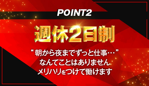 仕事とプライベートのメリハリをつけていただきたいので、週休1日/週休2日の選択制となっております。