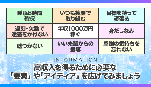 明確な評価指標でしっかりスキルアップしながら稼いでいただけます。高収入を得るために必要な「要素」「アイデア」を広げていきましょう!