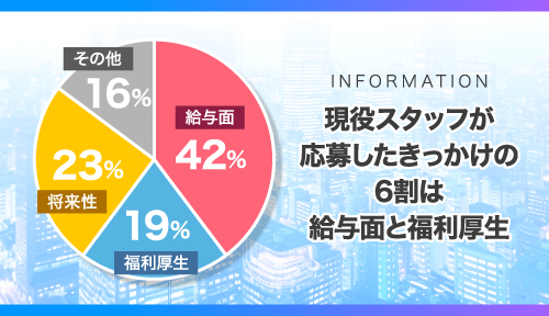 現役スタッフが応募したきっかけの6割は給与面と福利厚生!業績給や各種手当、楽しい社員旅行や食事会など充実した環境です。