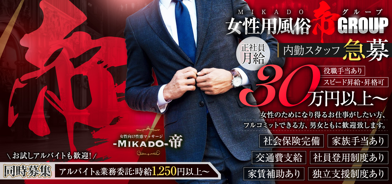 女性向け風俗の最高峰【帝グループ】内勤スタッフ急募!男女歓迎、事業拡大に伴い様々な職種で募集中。お試し体験アルバイトも歓迎!社会保険完備・交通費支給・家賃補助etc…安定の高待遇でお迎え致します。