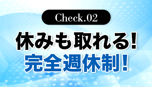 完全週休制、9時間勤務!メリハリのある職場環境です。夏休み、年末年始休暇、有給休暇も取得可能!プライベートを大切にしていただけます。