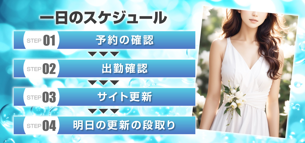 予約の確認→出勤確認→サイト更新→明日の更新の段取り→終わりになります!