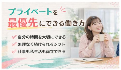 プライベートを最優先にできる働き方 ・自分の時間を大切にできる・無理なく続けられるシフト・仕事も私生活も両立