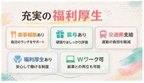 充実の福利厚生/食事補助あり/賞与あり/交通費支給/週休2日/Wワーク可/車・バイク通勤可/未経験者歓迎/経験者優遇/服装自由