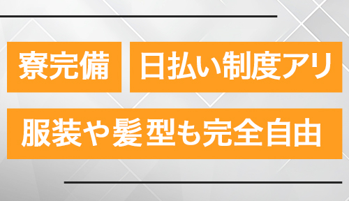 すぐに勤務していただけるように寮も完備 日払い制度もあり すぐに安定した生活を始められます。服装や髪型、髭やタトゥーなど完全自由
