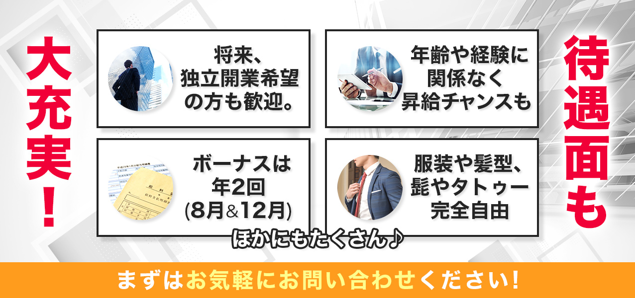 業界未経験でも35万円以上スタート!最短入社3か月で50万以上の実績あり! 店長や幹部候補、経験者は更に優遇!寮も完備!
