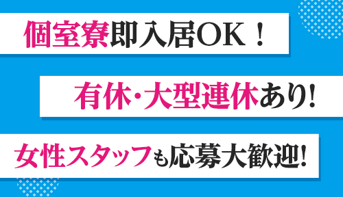 ◆スタッフを大切に育てながら新店舗を次々立ち上げています!◆【日払OK・有給&大型連休あり・個室寮即入居OK・体入相談OK・髪型自由・ティッシュ配布なし・女性の応募大歓迎。】