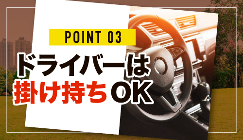 各種待遇:ドライバーは本業との掛け持ちOK(副業OK)、服装髪型自由、交通費支給、日払い対応など嬉しい待遇ご用意しています!