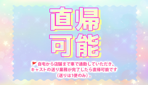お店終業後にキャストを送り届けていただくドライバーを募集!自宅から店舗まで車で通勤していただき、キャストの送り業務が完了したら直帰可能です(送りは1便のみ)。