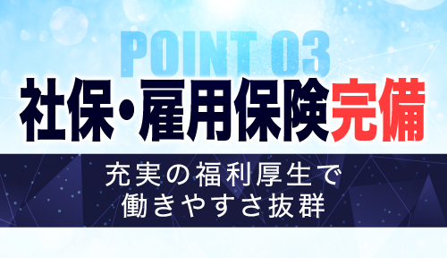 社保・雇用保険完備!入社してすぐ入れます。そのほか充実の福利厚生で働きやすさ抜群です。未経験、異業種からの転職も安心◎